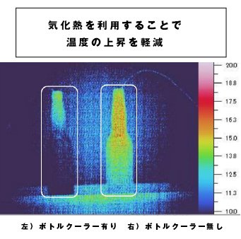 室温約25℃の環境下で,ワインボトルに水(約9_℃)を入れ,ボトルクーラーの有無による内容物の温度変化を調べました。約四時間後、(含水11g)
