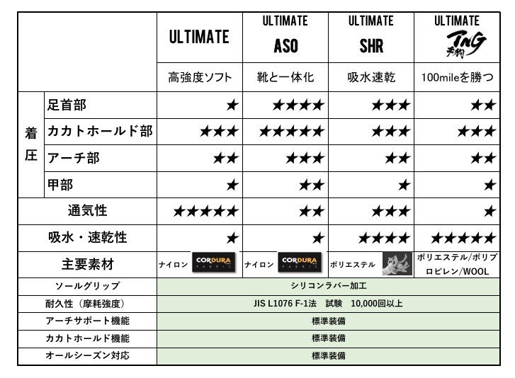 通気性◎ / 破れにくい / 足裏シリコンラバー / アーチサポート / ミドル~ロングに最適
